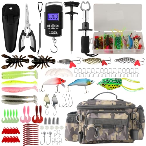 - ALL-IN-ONE FISHING TOOL SET - mouhike fishing gear kit includes Fishing Tackle Bag, Fishing Pliers with Sheath Lanyard, Fish Lip Gripper, Fish Hook Remover, Fish Scale(Batteries Not Included), 107pcs Hard & Soft Lures Hook with Storage Box. Perfect gift for your friends and family on Father's Day, Valentine's Day, Christmas Day, Birthday and any Holiday